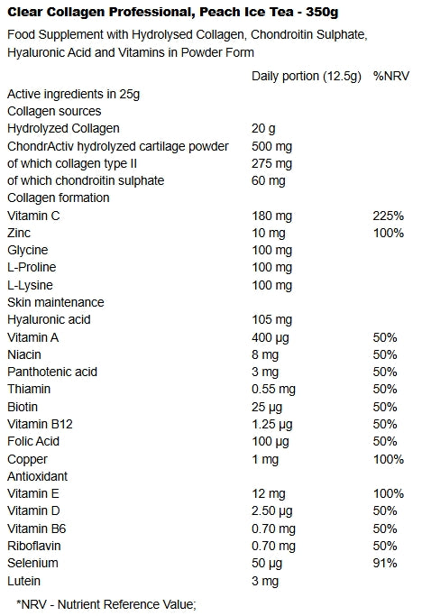 Clear Collagen Professional pushes beyond basic supplementation with a bold formulation anchored in collagen science. Glycine, proline, and lysine work as the molecular foundation for collagen synthesis, while 180 mg of vitamin C amplifies this effect—driving normal collagen formation while fortifying skin, blood vessels, bones, cartilage, teeth, and gums.