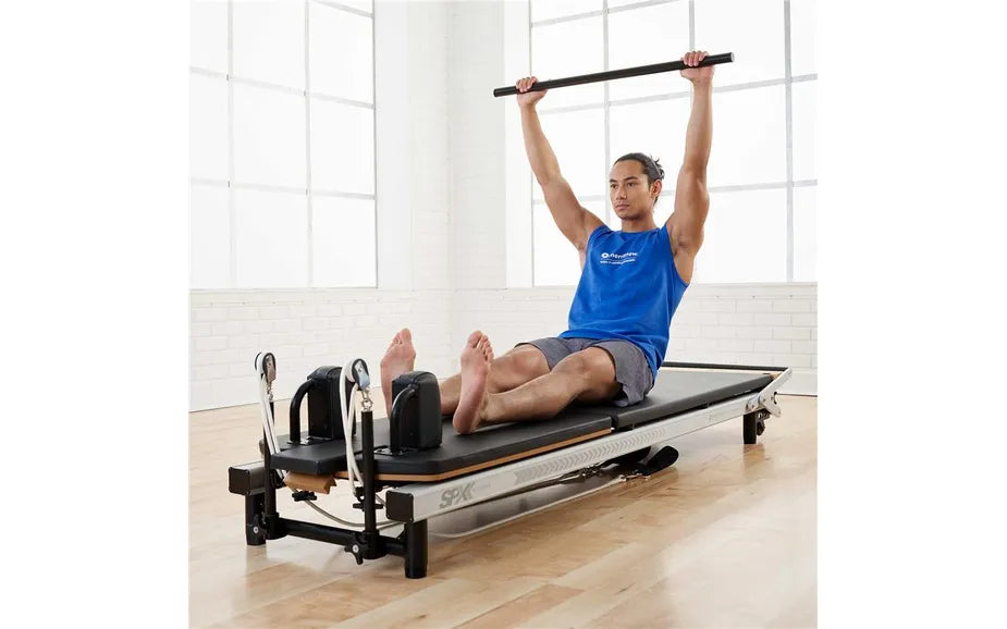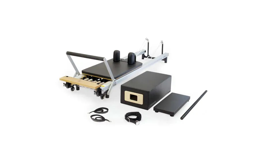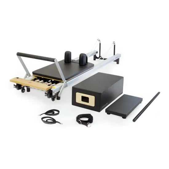 - Includes Reformer Box with footstrap, Padded Platform Extender, and Metal Roll-up Pole